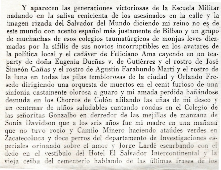 Sin importar las fechas, los espectros vivos del pasado acechan el jolgorio del presente. Fulgurantes aparecen Feliciano Ama y Farabundo Martí (1932 sin manifiestos en el idioma materno), al igual que José Simeón Cañas (1838). Entretanto, los recuerdos personales se entremezclan con la colecta que resucita el pretérito en fantasma. «Mi amada...desnuda» atiza el «deseo» carnal de Dalton G., a la vez que restituye su infancia perdida en el tiempo del «Colegio de las señoritas Gonzalbo». Asimismo, transitan sus contemporáneos, tal cual el historiador Jorge Lardé, Orlando Fresedo, con «su orquesta de muertos» y Camilo Minero quien enlaza el arte plástico con las funerarias, esto es, la pintura de la historia, «ataúdes verdes» en esperanza (véase la figura coronada de Aquino, bajo la firma de Minero, esto es, el retrato del pasado según el presente). Su arte es necesario puesto que a su lado —bajo el cielo azulado— ladran «los perros que orinan el amor».  Asimismo el axis mundi de «la Ceiba» transcribe el testimonio «de los fusilados» y la «propia muerte» de la flora, cuyo follaje se llama «hoja», el mismo asiento de la escritura. Así lo declaran hoy el régimen de excepción y El Espino.