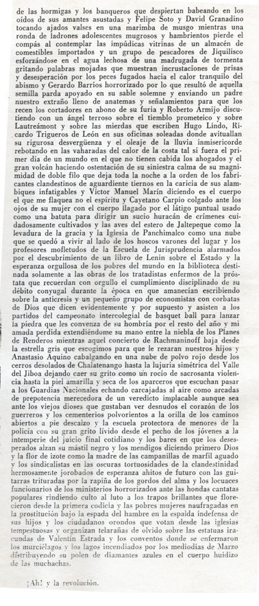 Según el orden arbitrario del ensueño, las apariciones continúan sus relatos en «libros mentirosos» y en «Monumentos» que conmemoran la «Revolución de 1948», «los periódicos», y los «cuarteles» que albergan «el odio», en actos criminales hasta la fecha del escrito y aún después. Siempre regresa el espectro del «General Martínez» unto a «la hojarasca» de la sequía. A contrapeso, en el bando opuesto, quizás, describe el ambiguo arquetipo de la vigencia liberadora,«Monseñor Mario Casariego», cuya paradoja anhela el ingreso al «Partido Comunista». Es obvio que los seguidores de Dalton G. obran de manera similar al militar en las nuevas filas marxistas, excepto si validan en una literatura sin vivencia.